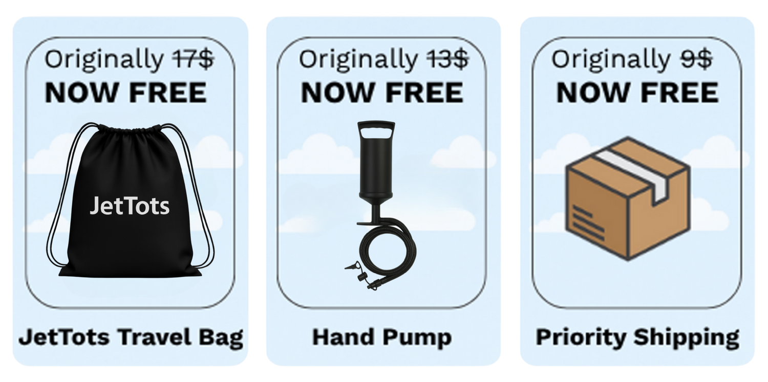 Ready in under 5 minutes with the included pump. Deflates in seconds when landing. So simple that parents use it on every flight without hassle.
